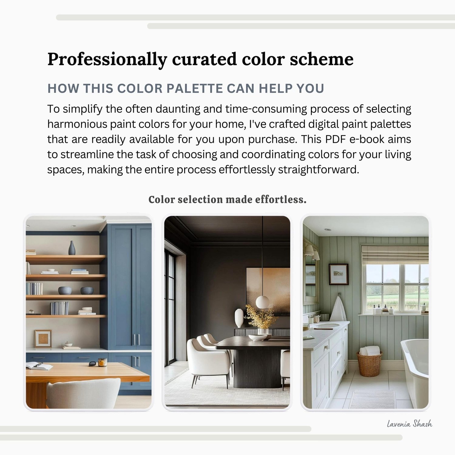 Choosing the right paint colors that will work together can be overwhelming and time-consuming. In an attempt to make finding colors that will work together less complicated and confusing for you, I have created these paint palettes that you can have immediate access to upon purchase. The objective of this guide is to make selecting and pairing colors for your home and space a breeze.