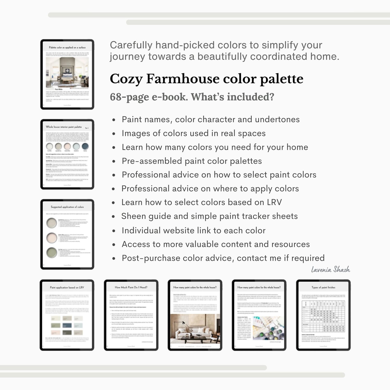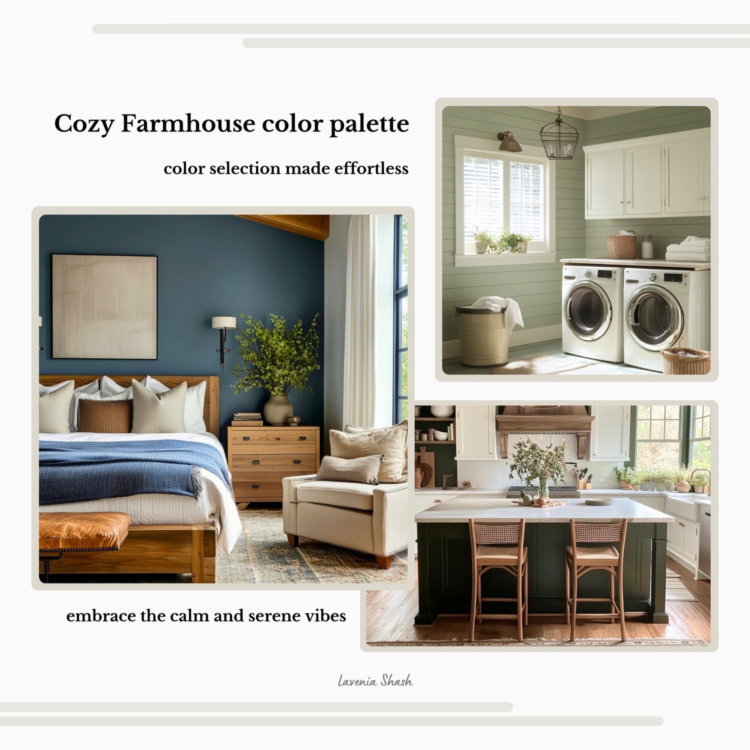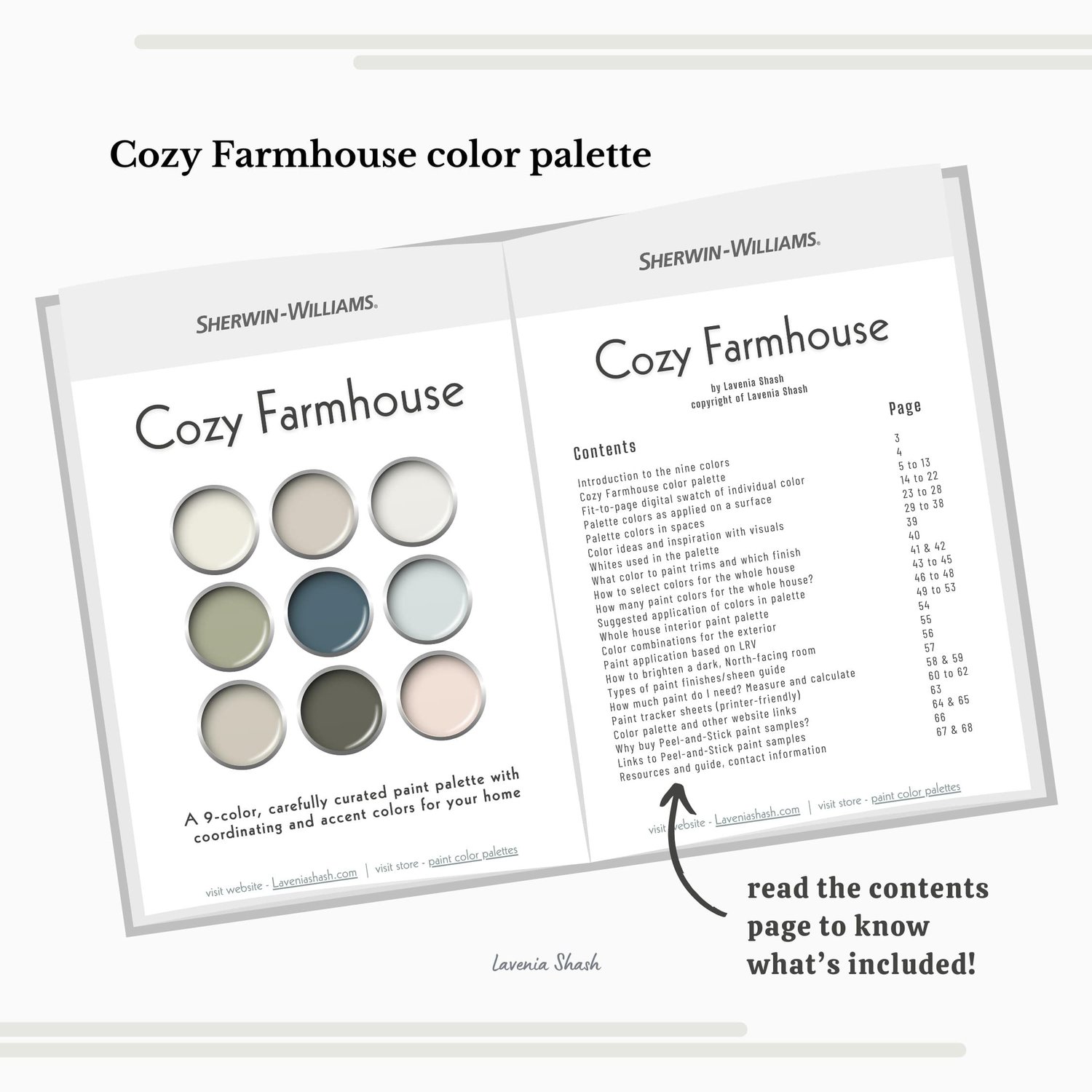 In addition to its versatility, the color scheme presents two dark shades, perfect for accent walls, kitchen islands, bathroom vanities, front doors, and more. This professionally curated palette ensures coordinated colors, cohesiveness, and a harmonious atmosphere, enabling you to effortlessly transform your living spaces into a cozy farmhouse retreat.