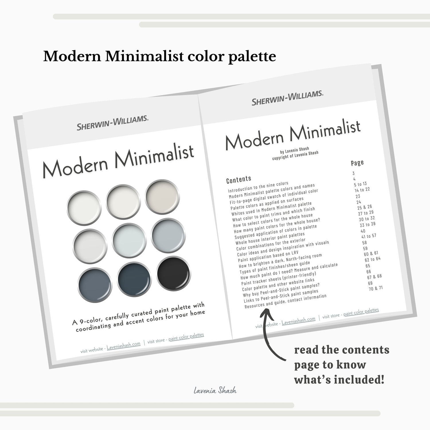 Modern minimalist paint colors - Sherwin Williams palette - blue, gray, white, black - Farmhouse, Scandinavian