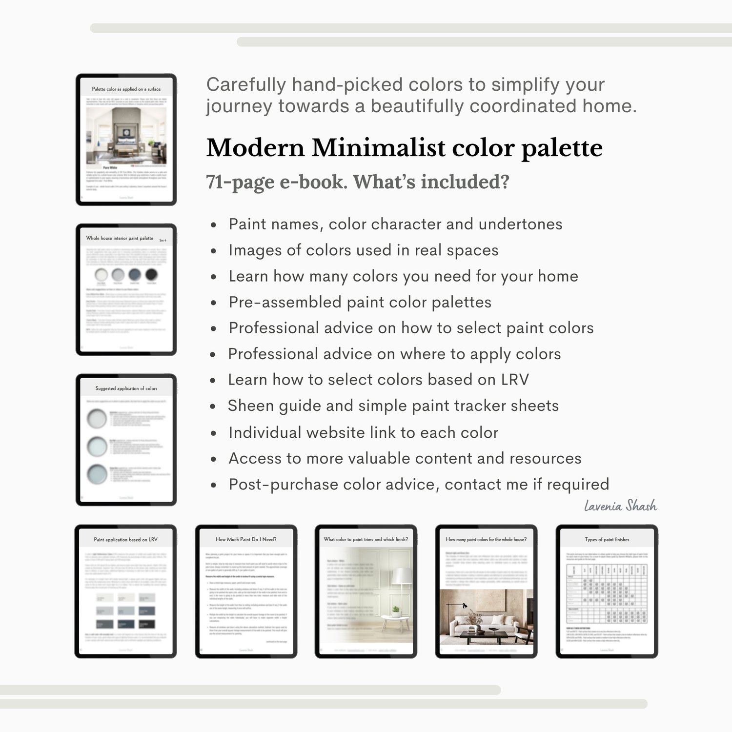 Designed to evoke a sense of tranquility and sophistication, the lighter tones offer ideal options for primary wall colors, while the deeper shades elevate spaces such as bedrooms, bathrooms, home offices, accent walls, kitchen cabinets and islands, bathroom vanities, and front doors, effortlessly enhancing the serene ambiance of your Modern Minimalist-style home.