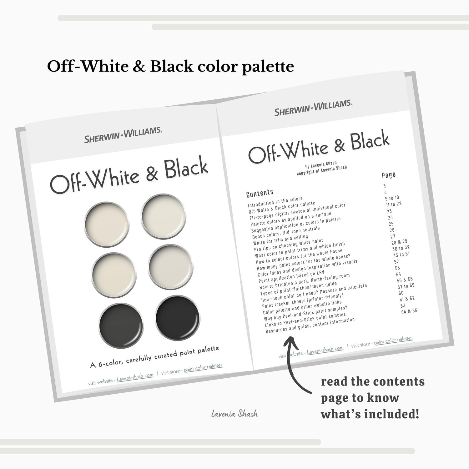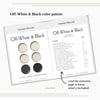 Off-White And Black color palette: If you love the timeless contrast of black and white but prefer a softer, more inviting take, this palette strikes the ideal balance. Instead of stark, bright whites, you’ll discover four thoughtfully chosen off-whites that maintain lightness while adding subtle depth and character - perfect for spaces filled with natural sunlight.