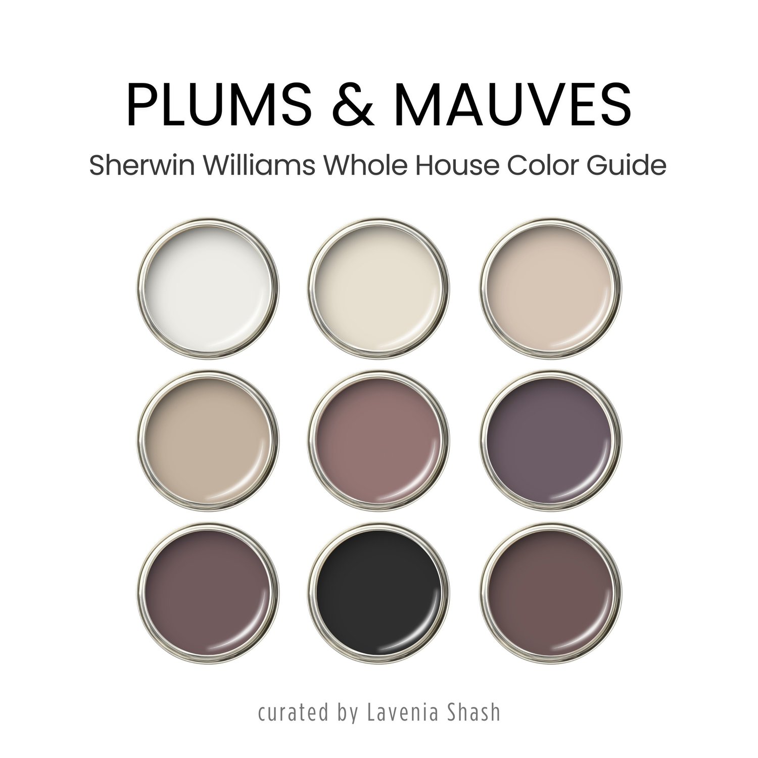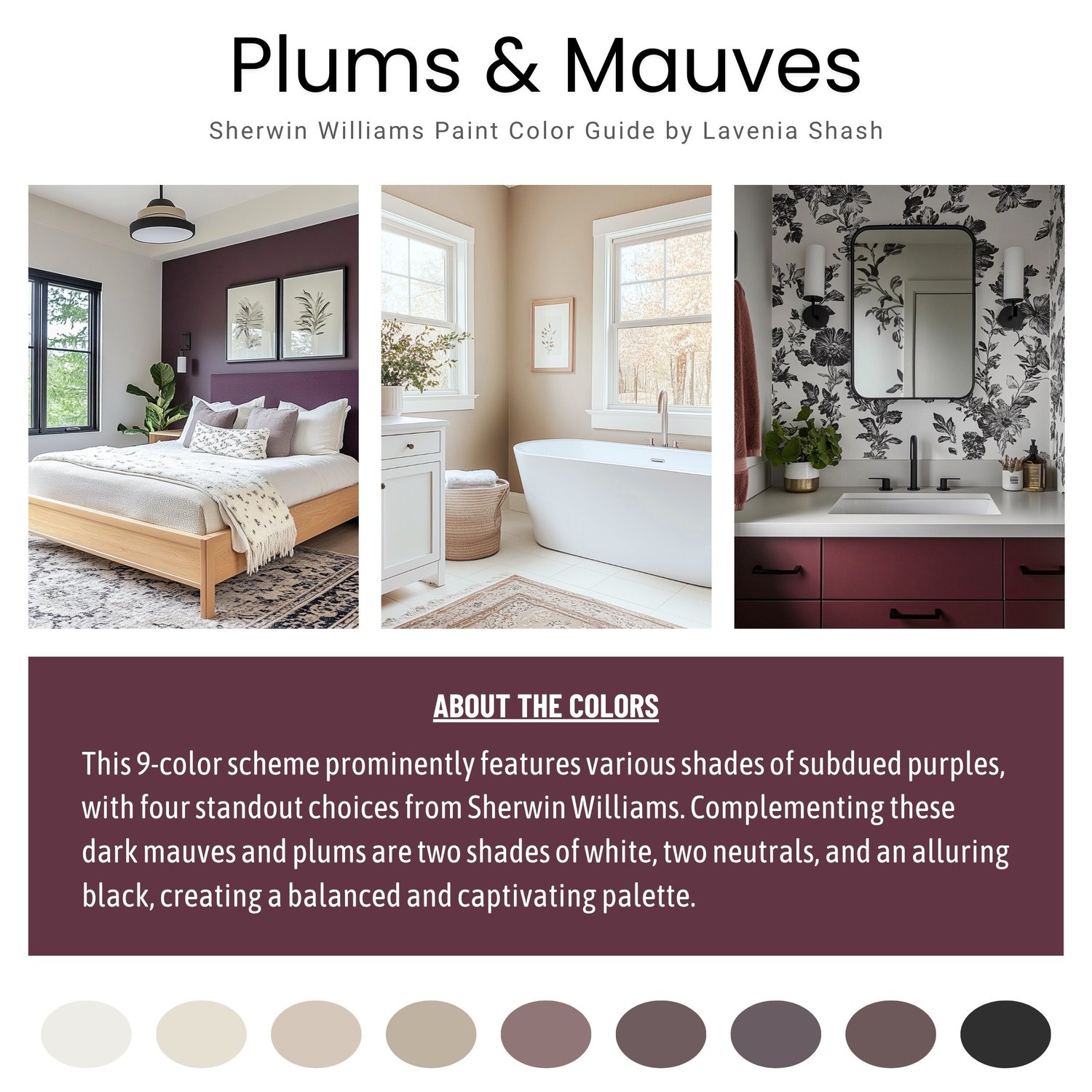 Introducing the Plums & Mauves color palette, a professionally curated selection of nine exquisite Sherwin Williams hues designed to showcase the elegance and charm of purple tones. Perfect for those who adore purple and wish to infuse its captivating beauty into their homes, this palette blends versatility with sophistication.