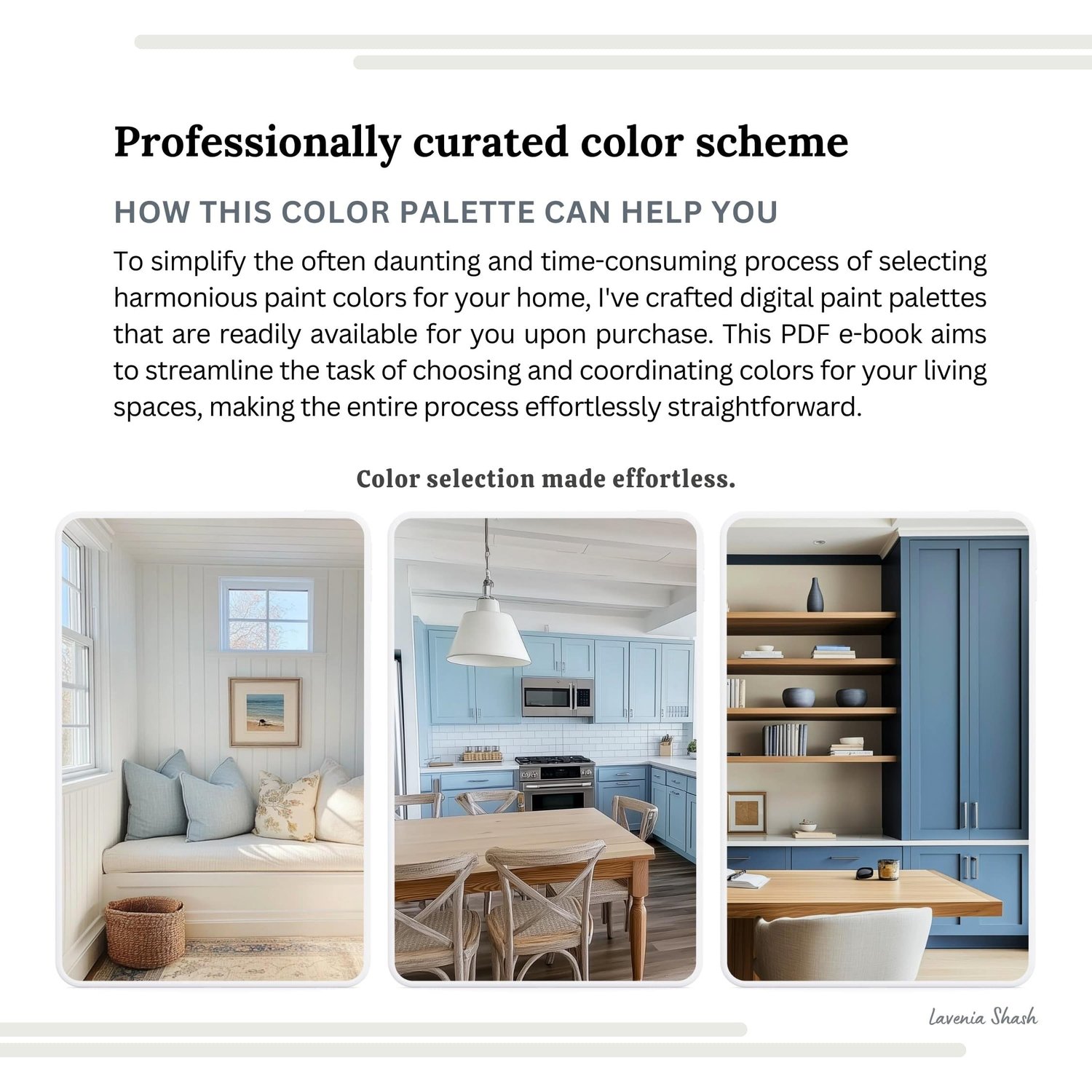 In addition to its versatility, the color scheme presents one dark blue shade, perfect for accent walls, kitchen islands, bathroom vanities, front doors, and more. This professionally curated palette ensures coordinated colors, cohesiveness, and a harmonious atmosphere, enabling you to effortlessly transform your living spaces into a modern and cozy retreat.