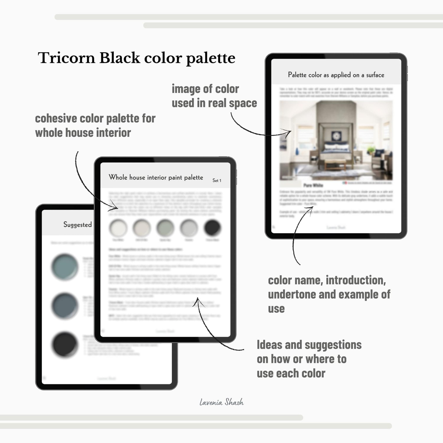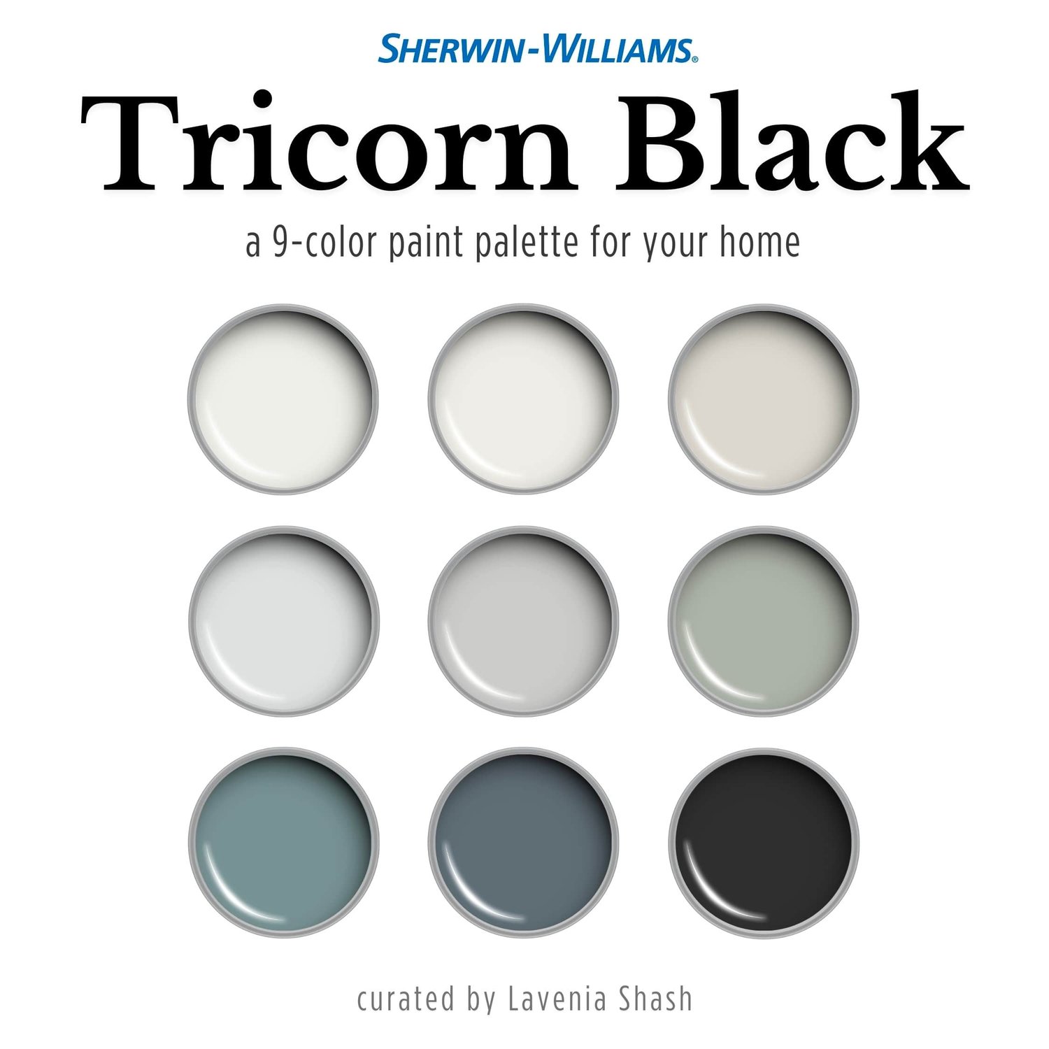 Within the Tricorn Black palette, you'll find a harmonious ensemble of hues, each meticulously chosen to ensure cohesiveness and a modern aesthetic throughout your living spaces. Alongside the captivating Tricorn Black, I've included a crisp clean white and a soft white, providing the perfect backdrop for your design visions.